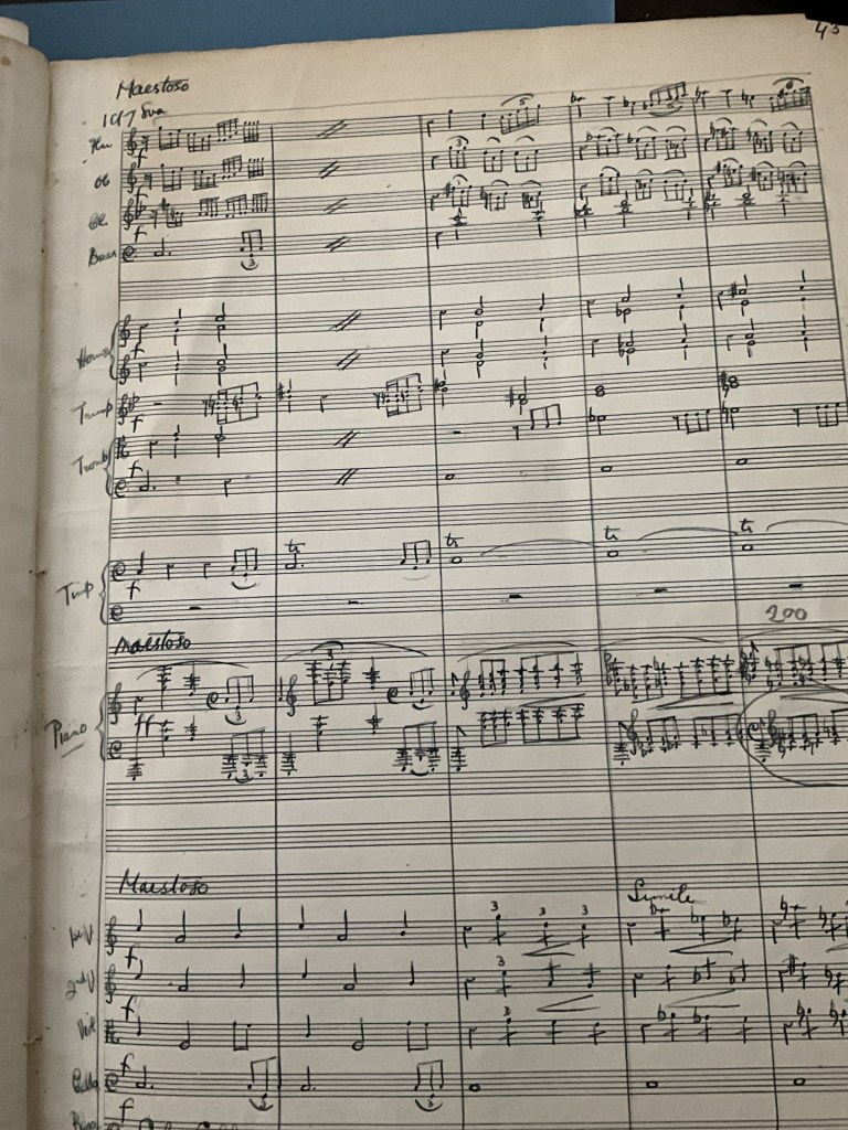 And so the abstract score becomes physical reality. Two rehearsals so far, sadly not with the full orchestra yet (I’m dying to see how her meaty trombone writing sounds), but enough to see that, as well as her gift for melodic writing and late-Romantic harmonic lushness, she had an ear for sensitive wind writing. In particular, the oboe and horn are used in a semi-concertante manner, duetting with the piano in the more lyrical passages. The string writing is adequate but perhaps a little thin and I might exercise filial rights and fill it out a bit before publication! The piano writing itself is entirely idiomatic, with an unfailing ear for voicing and spacing, not quite virtuosic but with rich textures, indicating that she was no mean pianist for a 2nd-year student.